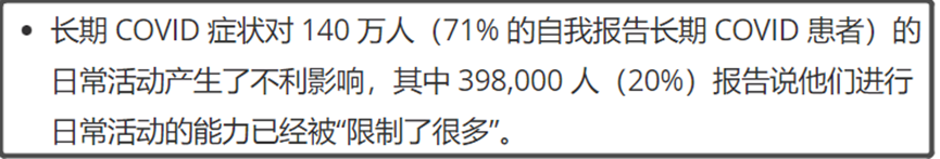 同时报告还显示,这200万新冠后遗症患者里,71%的人认为对自己日常活动产生不利影响,另外有20%的人认为他们进行日常活动的能力已经被限制了很多。