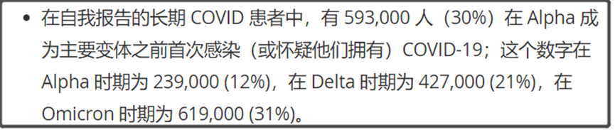 该报告数据显示,这200万新冠后遗症患者里,30%是感染原始毒株,12%是阿尔法流行期间感染,21%是德尔塔流行期间感染,有31%是在奥密克戎流行期间感染。