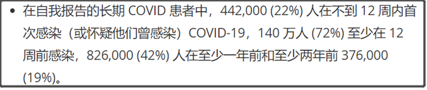 其中这200万新冠后遗症患者里,有22%是12周内首次感染,另外有72%的人是在12周之前感染,并且其中有42%的人是在一年前感染,有19%的人是两年前感染。