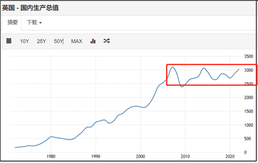从2008年至今,英国GDP整体并没有增长,处于停滞状态。