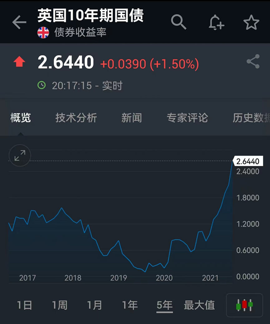 随着英国央行的持续加息,英国10年期国债收益率也出现大幅度飙升,已经从0利率附近涨到了2.64%。