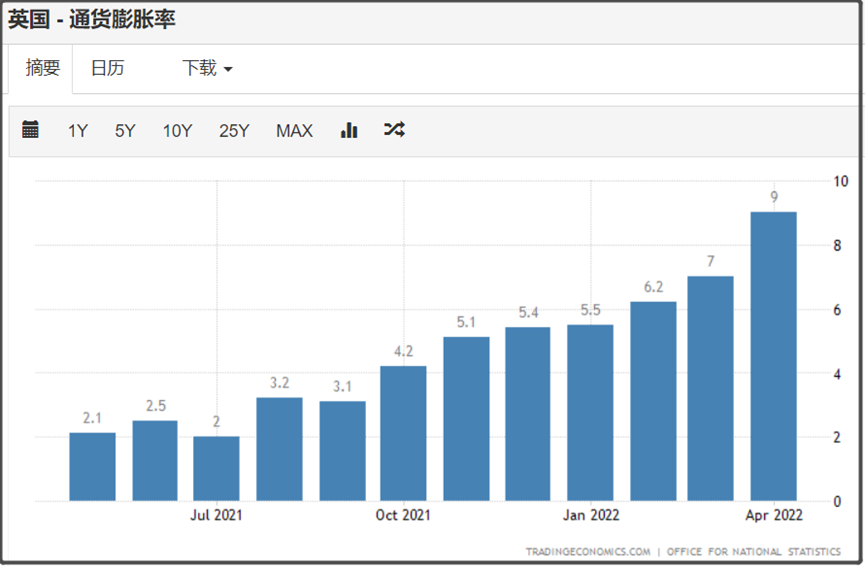 英国上个月公布的4月通胀率,是出现大幅度飙升,直接从7%通胀率,飙到了9%通胀率。