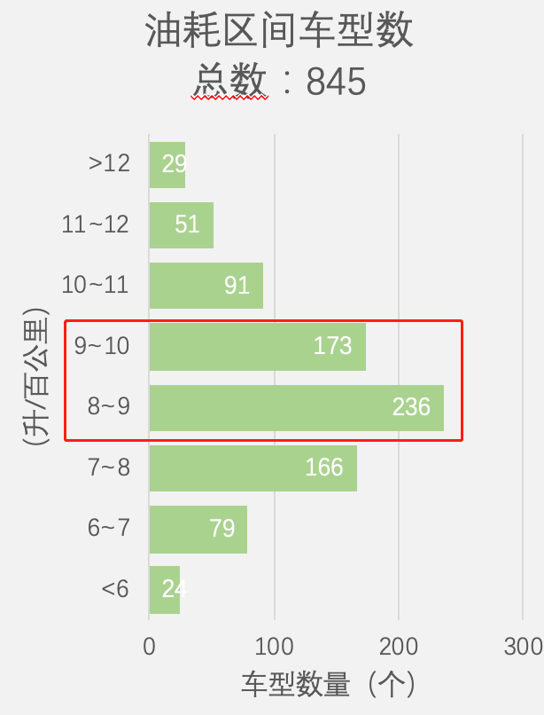 而在2019年发布的新车型里,百公里油耗的分布图如下。