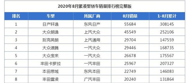 而我们查一下最新8月份的轿车销量排行榜就可以发现,4万辆的这个销量,已经是可以排进前三,逼近第一的水平。