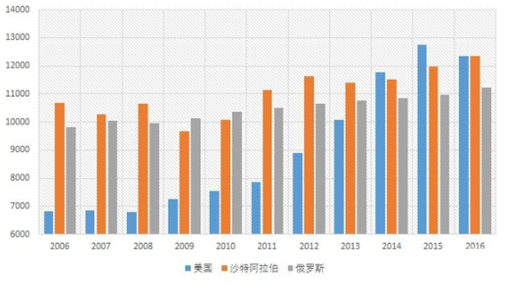 从上图可以看到,在2012年之前,美国的石油产量还远低于俄罗斯和沙特。