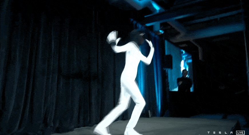 因为这段特斯拉“机器人”跳舞的片段,实际上是去年8月,马斯克首次宣布特斯拉机器人“擎天柱”的发布会上,请一个舞者穿着道具服,所做的演示。