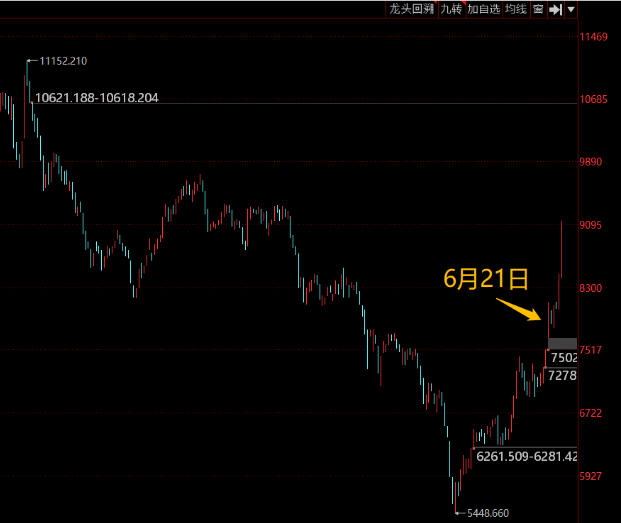 然后在6月21日之前,已经跟随大盘反弹30%,然后在6月21日开始,就连续出现大涨,成交量也迅速放大。