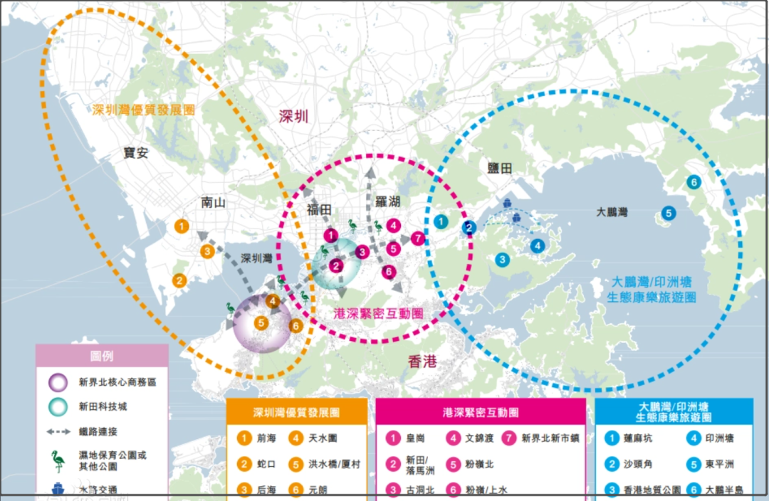 整个香港的北部都会区,大致会分为3大区域:深圳湾优质发展圈、港深紧密互动圈、生态旅游圈。