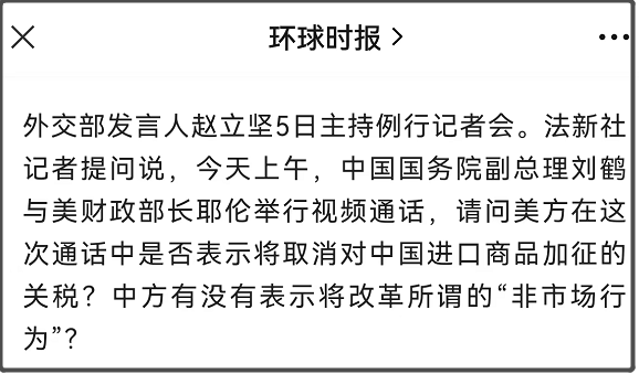 而这次是说“中方表达了对美国取消对华加征关税和制裁、公平对待中国企业等问题的关切。”