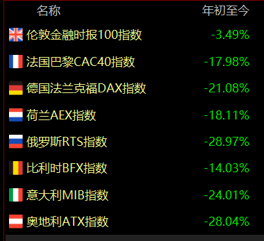 除了伦敦股市还比较坚挺之外,欧洲股市今年普遍下跌幅度在20%左右。