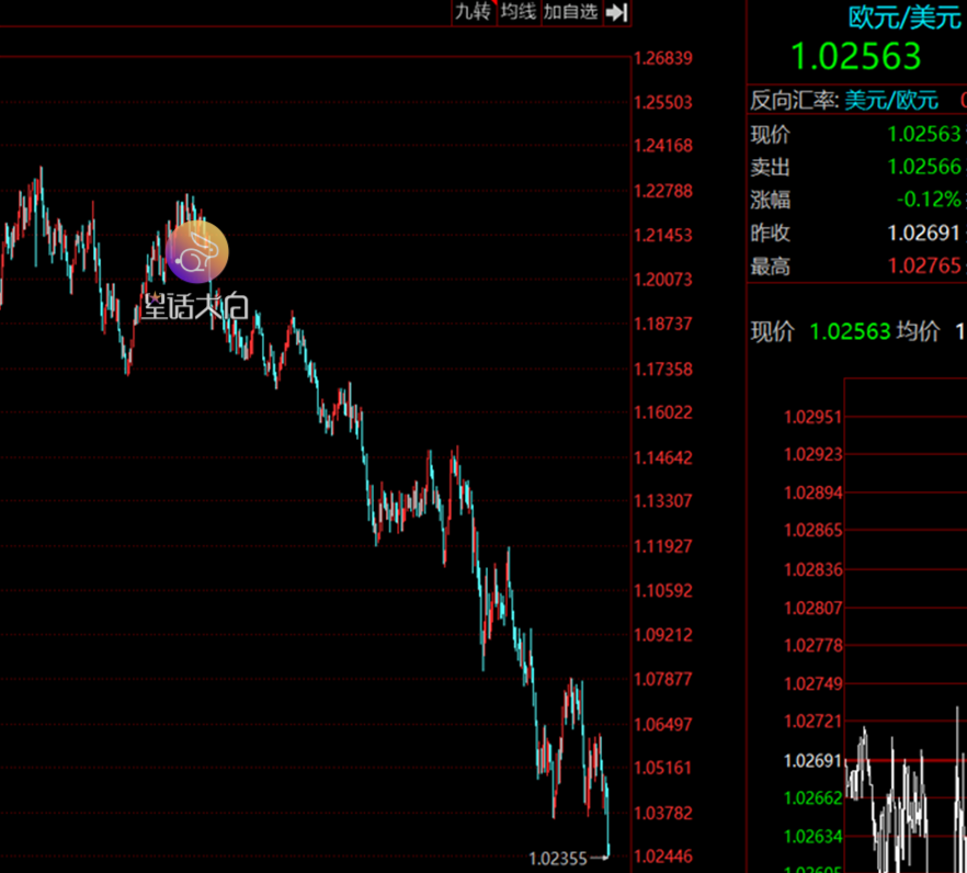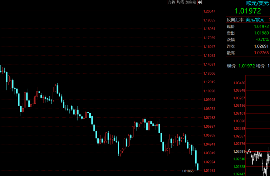 欧元汇率已经跌到了1.02,在一年前1欧元还能兑换1.22美元,现在已经跌没了16%,距离跌破跟美元1:1已经不远了。