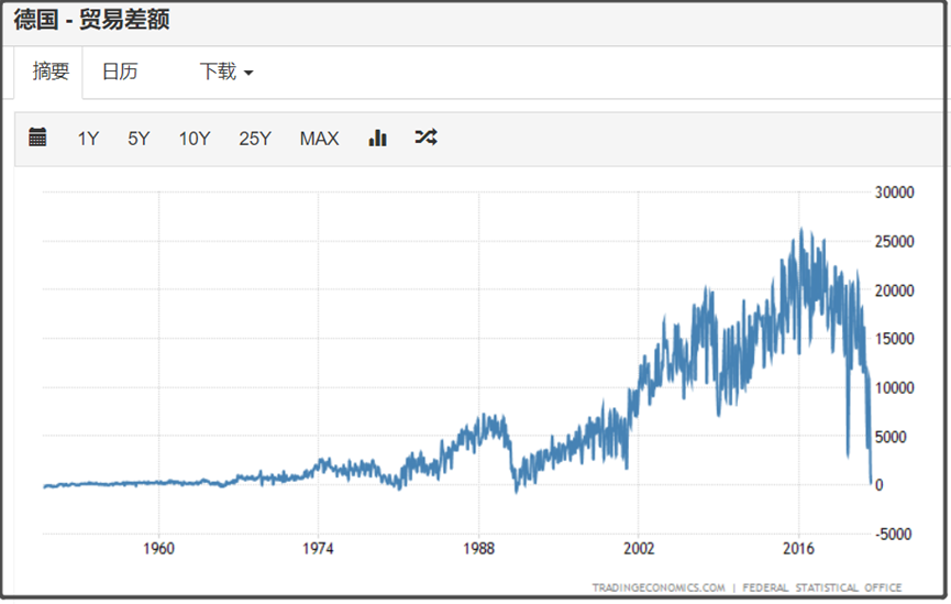 可以看到,过去这几十年,德国只有两次出现贸易逆差。
