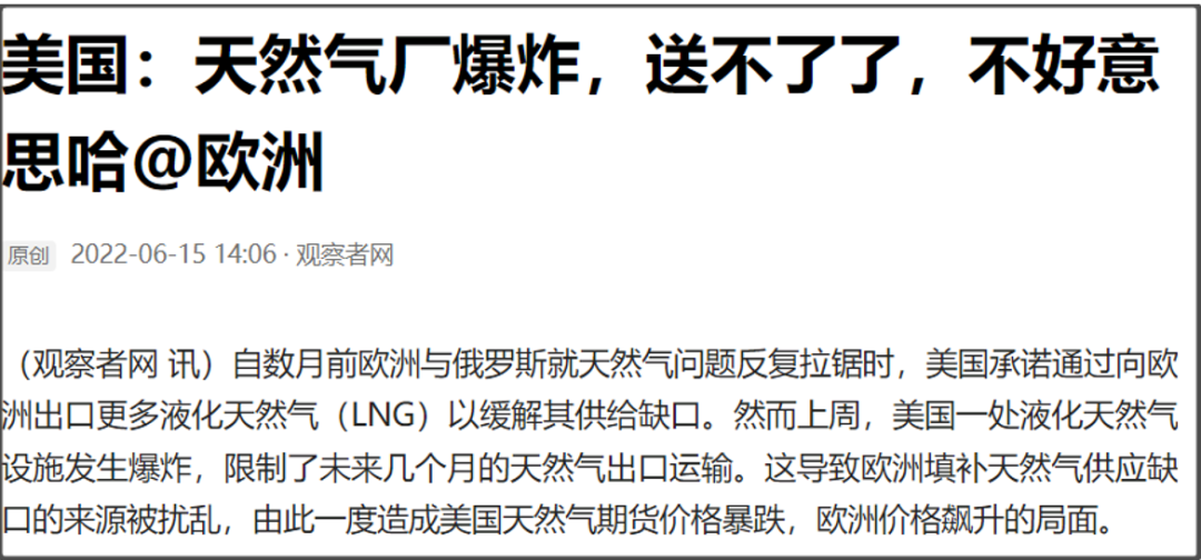 让欧洲雪上加霜的是,美国出口欧洲天然气的一个重要港口,在6月8日发生了“不明原因”的爆炸,这导致这个美国对欧天然气出口的重要港口未来90天将不能正常使用,这会影响美国对欧洲14%的天然气出口。