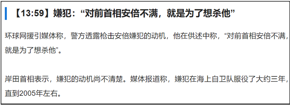 而警方也透露了嫌犯枪击安倍的动机,枪手自己供述称“对安倍不满,就是为了想杀他”。