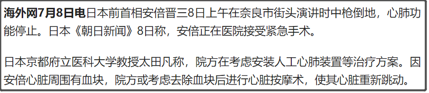 不过结合之前一些媒体报道安倍在送到医院时已经处于心肺功能停止状态,所以才有了安倍失去生命体征的报道。
