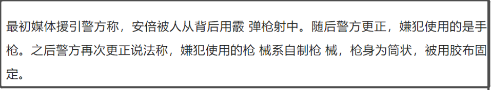 最后日本警方再次更正说法,称嫌犯使用的是自制枪械,枪身为筒状,被用胶布固定。