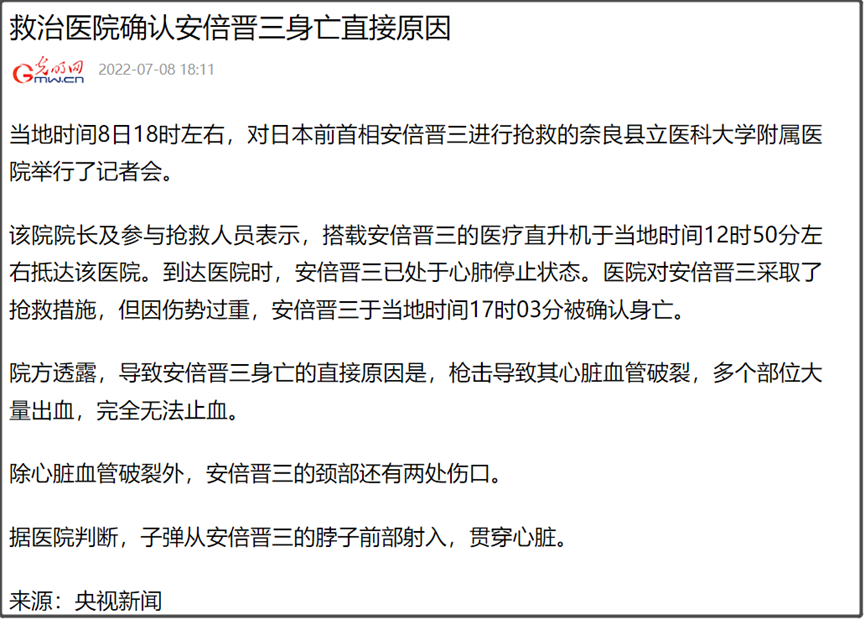 安倍死亡直接原因是枪击导致其心脏血管破裂,多个部位大出血,完全无法止血。