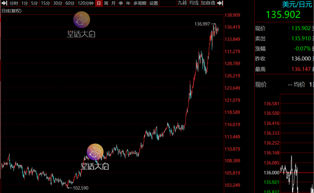 从去年初1美元兑换102.5日元,跌到现在变成136,最大贬值幅度达到了25%。