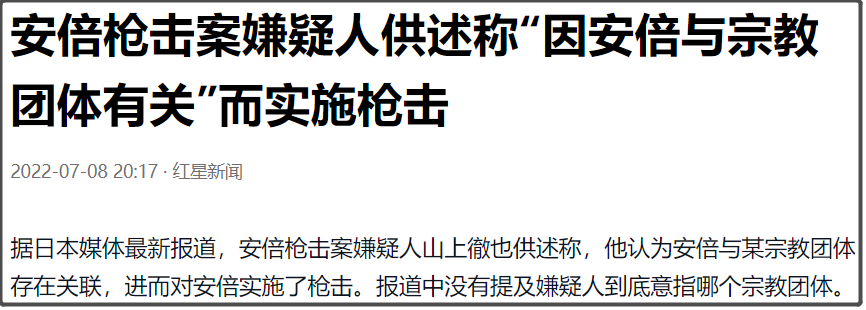 但文章刚写完,有一个最新报道,枪手供述称,他认为安倍与某宗教团体存在关联,进而对安倍实施了枪击。但报道里没说是指哪个宗教团体。