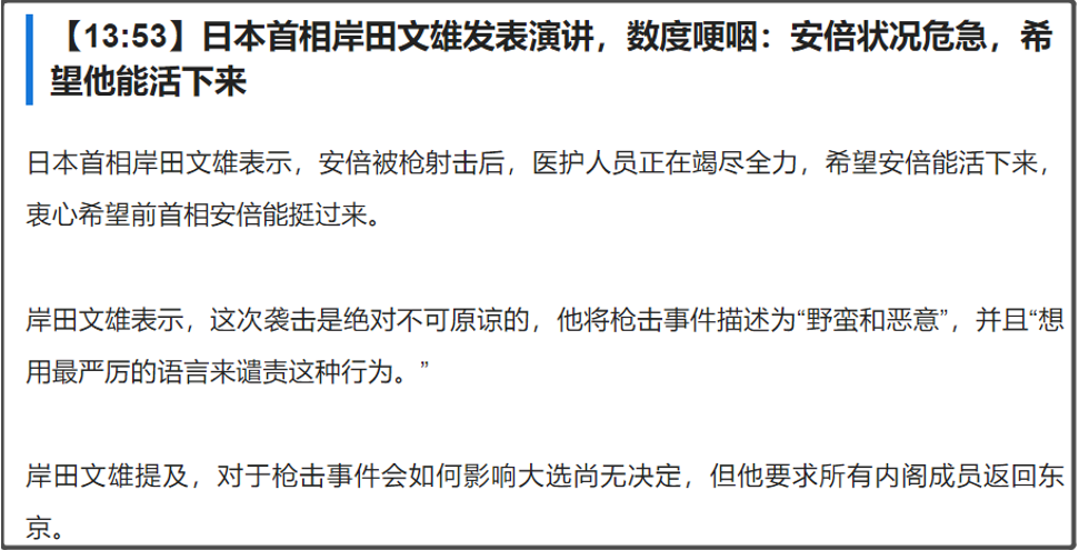 岸田文雄则在下午1点多发表了演讲,称安倍状况危急,希望他能活下来。