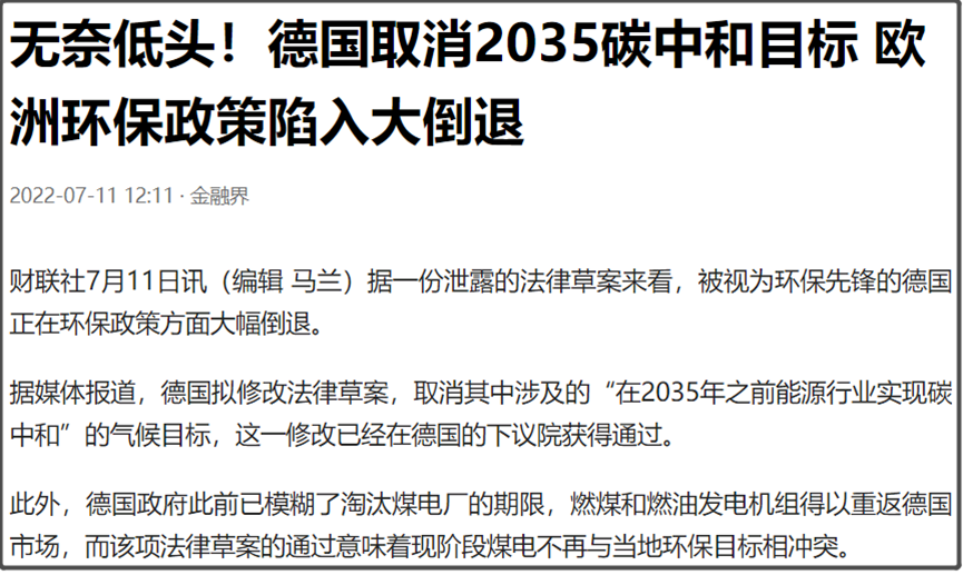1、《无奈低头!德国取消2035碳中和目标 欧洲环保政策陷入大倒退》