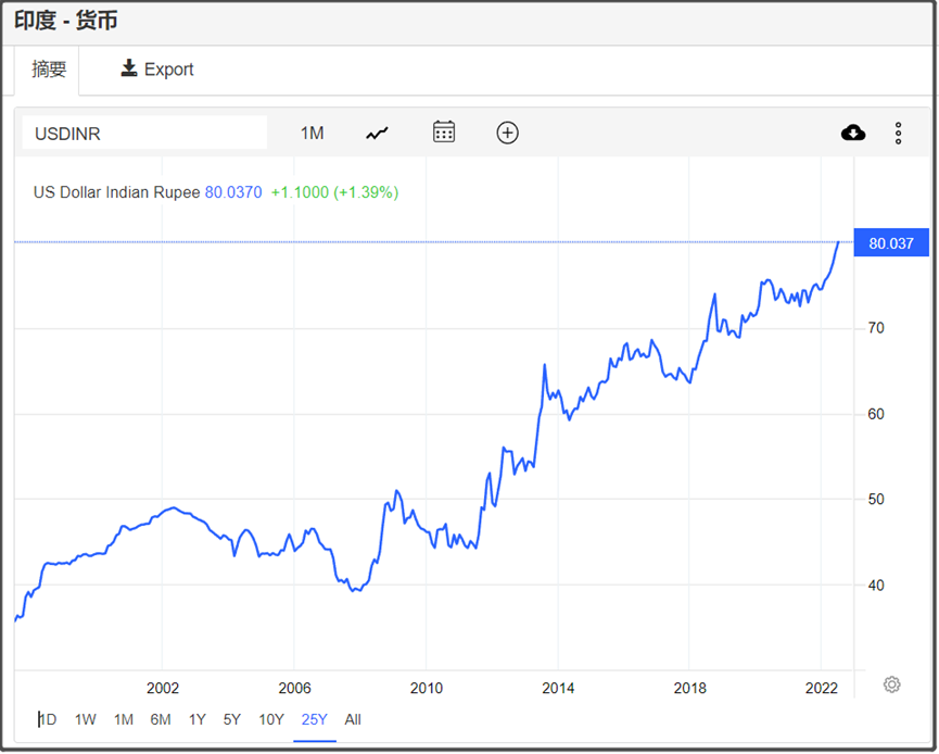 去年印度卢比还保持在72附近徘徊,但今年卢比就从74,一路贬值到80,贬值幅度达7.5%。
