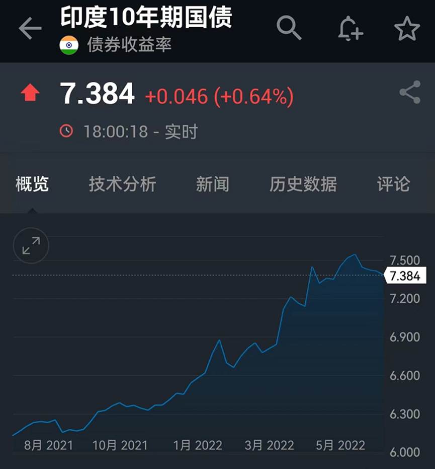 过去这一年,印度10年期国债收益率从6.3%,持续上涨到现在7.3%,这意味着印度债券也面临持续的抛售潮,价格持续下跌,资金持续流出。