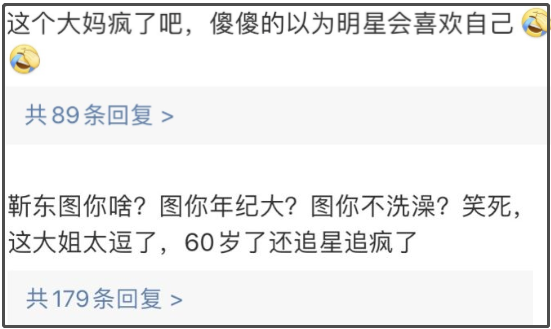 事情一出来后,马上就在网络上炸了锅,很多网友都对这位大妈是冷嘲热讽,大概就是在嘲笑她也不照照镜子,想想为啥明星要跑来跟60岁大妈谈情说爱等等。