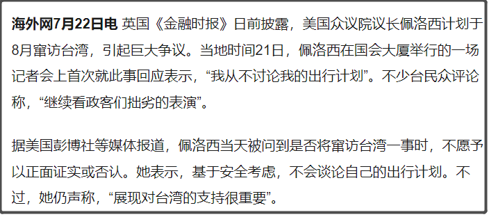 包括佩洛西今天也首次回应此事称,“我从不讨论我的出行计划”。