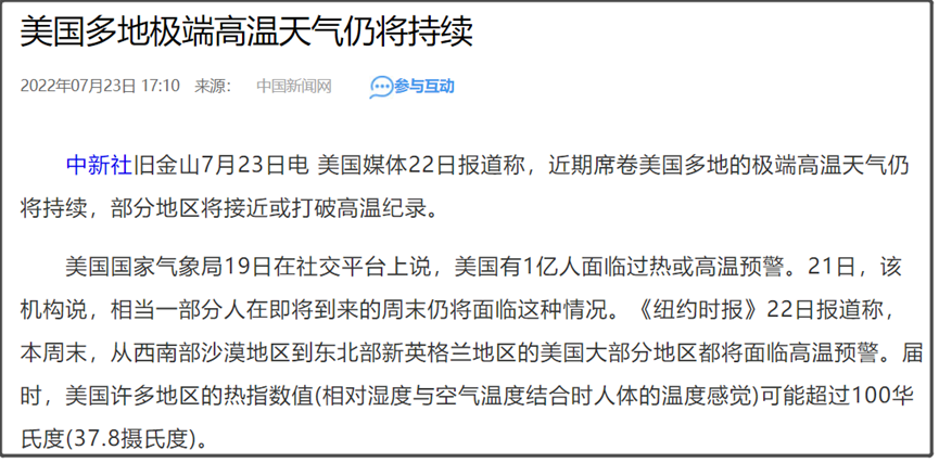 美国国家气象局19日在社交平台上说,美国有1亿人面临过热或高温预警。并且美国也有相当多地区的平均气温可能会超过37.8摄氏度。