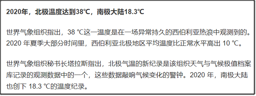 到了2020年则更夸张,北极圈气温居然也达到38摄氏度,比以前的正常水平高出10摄氏度,刷新了北极圈的高温记录。