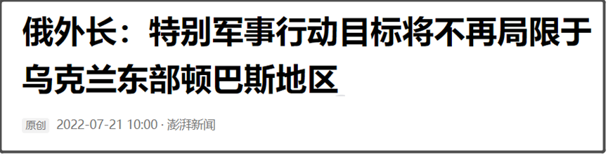 所以,俄罗斯外长在7月20日也表示,因“目前的情况发生改变”,俄方“特别军事行动”的地理目标将不再限于乌克兰东部顿巴斯地区。