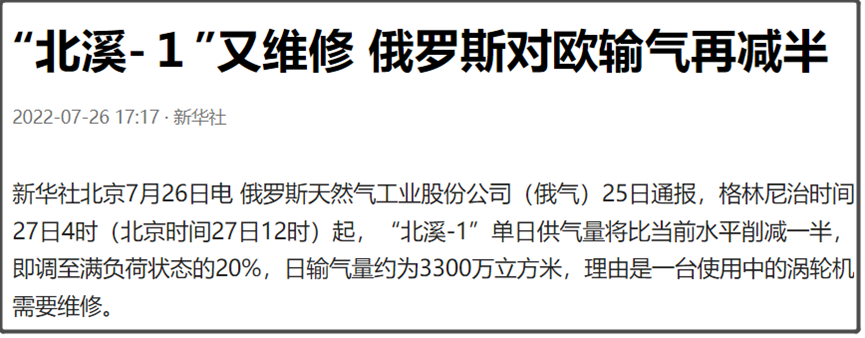 由于21号恢复供气后,北溪1号仍然只维持40%的供气量,本次是在这个基础上再减少一半,也就是只有20%的供气量。
