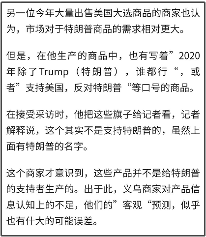 而且,就像上面截图报道一样,有的商户连自己生产的商品衣服上印着的是“支持特朗普”还是“反对特朗普”都分不清楚,只看到“特朗普”这个名字就以为自己卖的商品全都是支持特朗普的,而给出今年大选特朗普一定赢的结论。