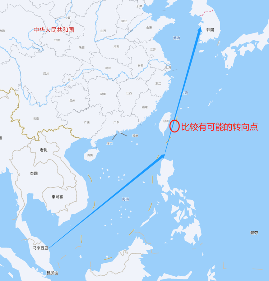 只有从马来西亚去韩国的航线,是会从我们对岸“擦肩而过”。