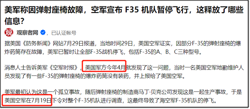 另外也有很多人说,美军前天不是刚发公告说F35的弹射座椅有问题,不能起飞吗?