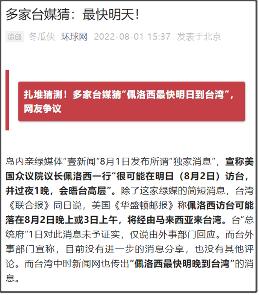 此外,对岸媒体今天也在扎堆猜测说,佩洛西最快可能8月2日晚上就会窜访。