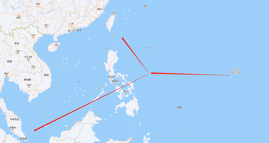 而关岛这个位置,往西飞就是菲律宾,这个时候其实还是有一些悬念,因为往北飞就是我们对岸,然后往西南飞才是前往新加坡。