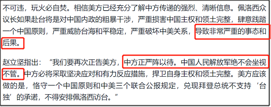 所以,这两天我看到还有很多人说,就算佩洛西敢去,我们也不会有什么动作。