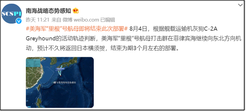 至少里根号是已经远离我们演训海域,预计不久将返回日本横须贺。