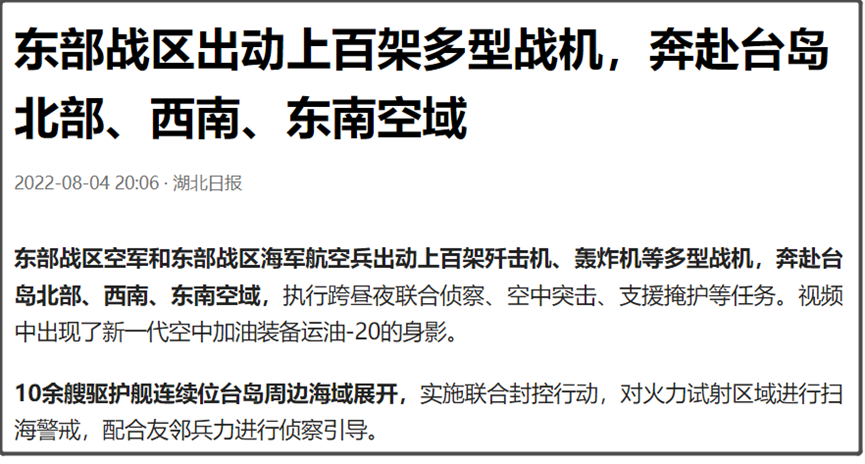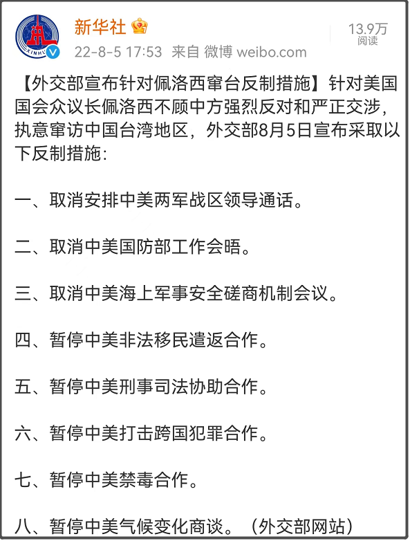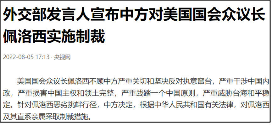 但是,因为佩洛西窜访落地成为事实,也让我们后续一系列反制的理由十分充分。