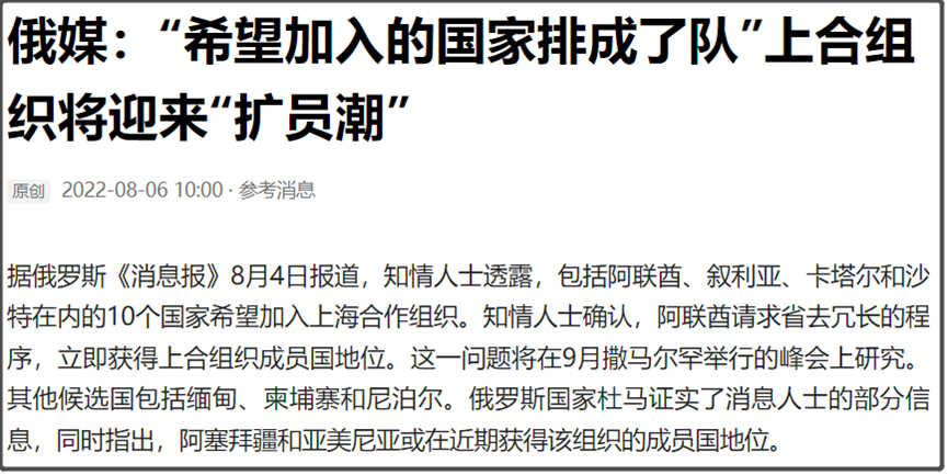 除此之外,在我们军事演训后,希望加入上合组织的国家,如雨后春笋般冒出,都快排成队了。