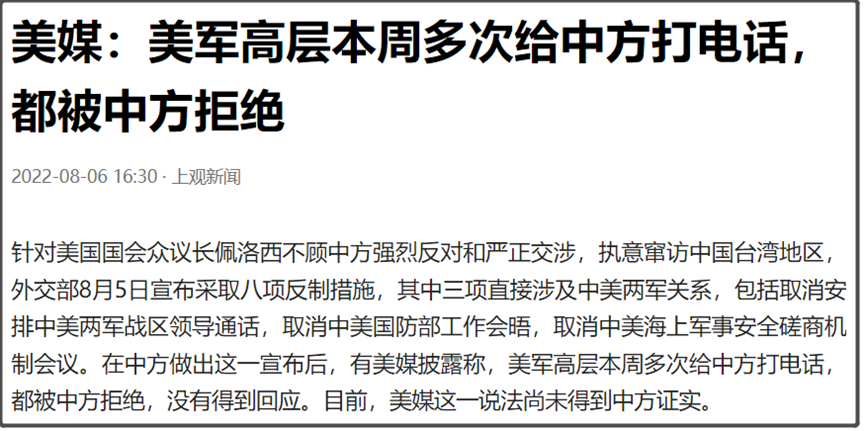比如,按照美国媒体报道,本周美军就多次给我们打电话,但都被我们拒接,不过这个说法,还没得到我们证实。
