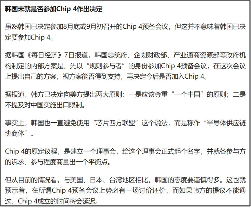 包括韩国认为要避免使用“芯片四方联盟”这个说法,而是称作“半导体供应链协商体”。