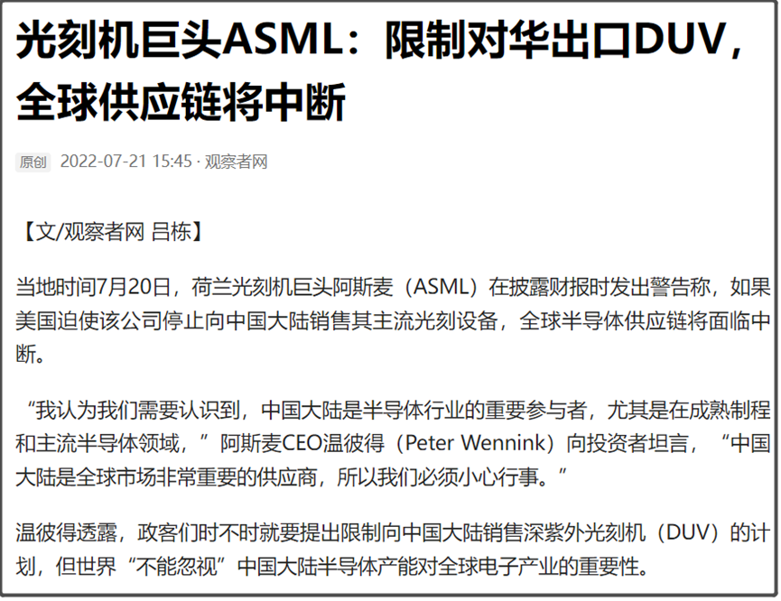 其实像ASML的CEO一直在发出警告,希望美国不要这样限制,并认为如果限制对华出口DUV光刻机,全球半导体供应链将中断。