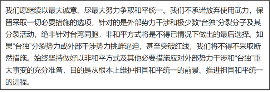 此外,这次的白皮书里,也提到“我们不承诺放弃使用武力,保留采取一切必要措施的选项,针对的是外部势力干涉和极少数“台独”分裂分子及其分裂活动,绝非针对对岸同胞,非和平方式将是不得已情况下做出的最后选择。”