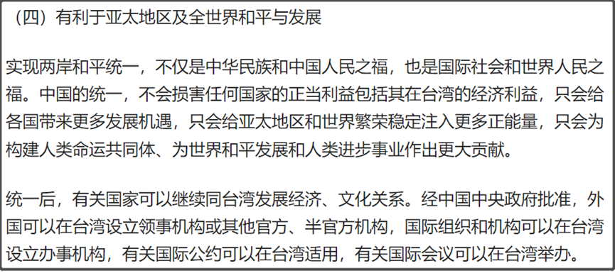 在这4点里,我们是做了一些统一后会怎么样的描述,比如台湾同胞的社会制度和生活方式等将得到充分尊重,台湾同胞的私人财产、宗教信仰、合法权益将得到充分保障。