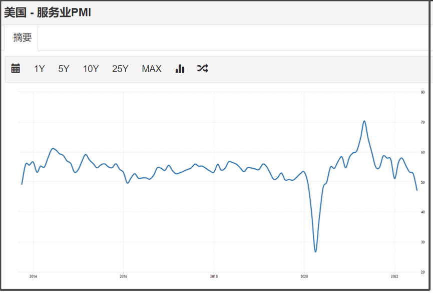 此外,美国7月服务业PMI,创下最近十几年来,除了2020年3月之外的最低值。
