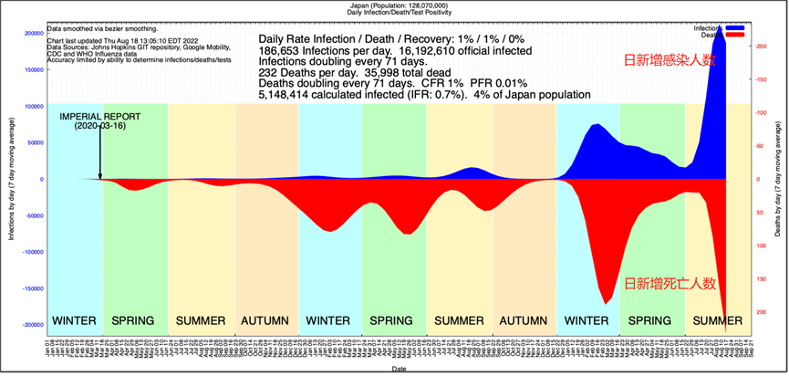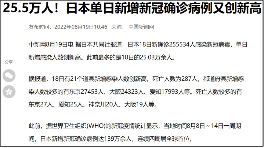 8月18日,日本是新增25.5万人感染,新增死亡人数287人。