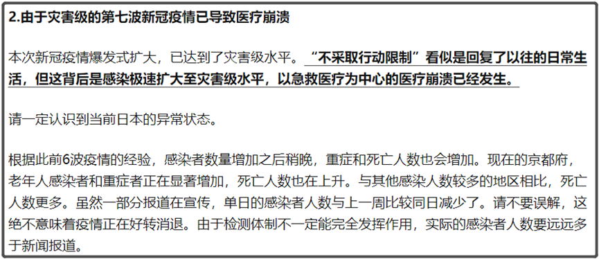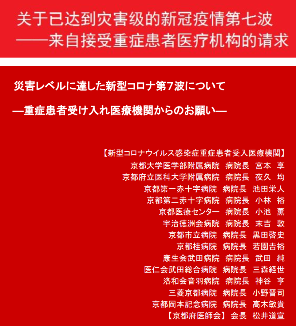 其中提到“在京都府的多家医院中,已反复发生集团感染,医务工作者因染疫需要离岗休息,这种情况每一家医院每天都有数十人到上百人不等。所有的医疗机构都在全力以赴拼命坚持,在京都府应对新冠疫情的病床床位实际上已经处于饱和状态,所有的医院都难以迅速收治患者。”